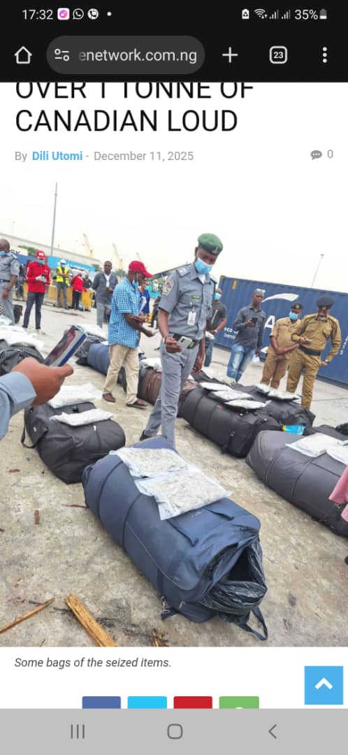 The Nigeria Customs Service (NCS) and the National Drug Law Enforcement Agency (NDLEA) have jointly intercepted a large consignment of Canadian Loud, a potent variation of cannabis, at the Apapa Port in Lagos. The seized drugs weigh 1,187 kilogrammes and were concealed in 55 bags hidden inside a container loaded with imported vehicles.